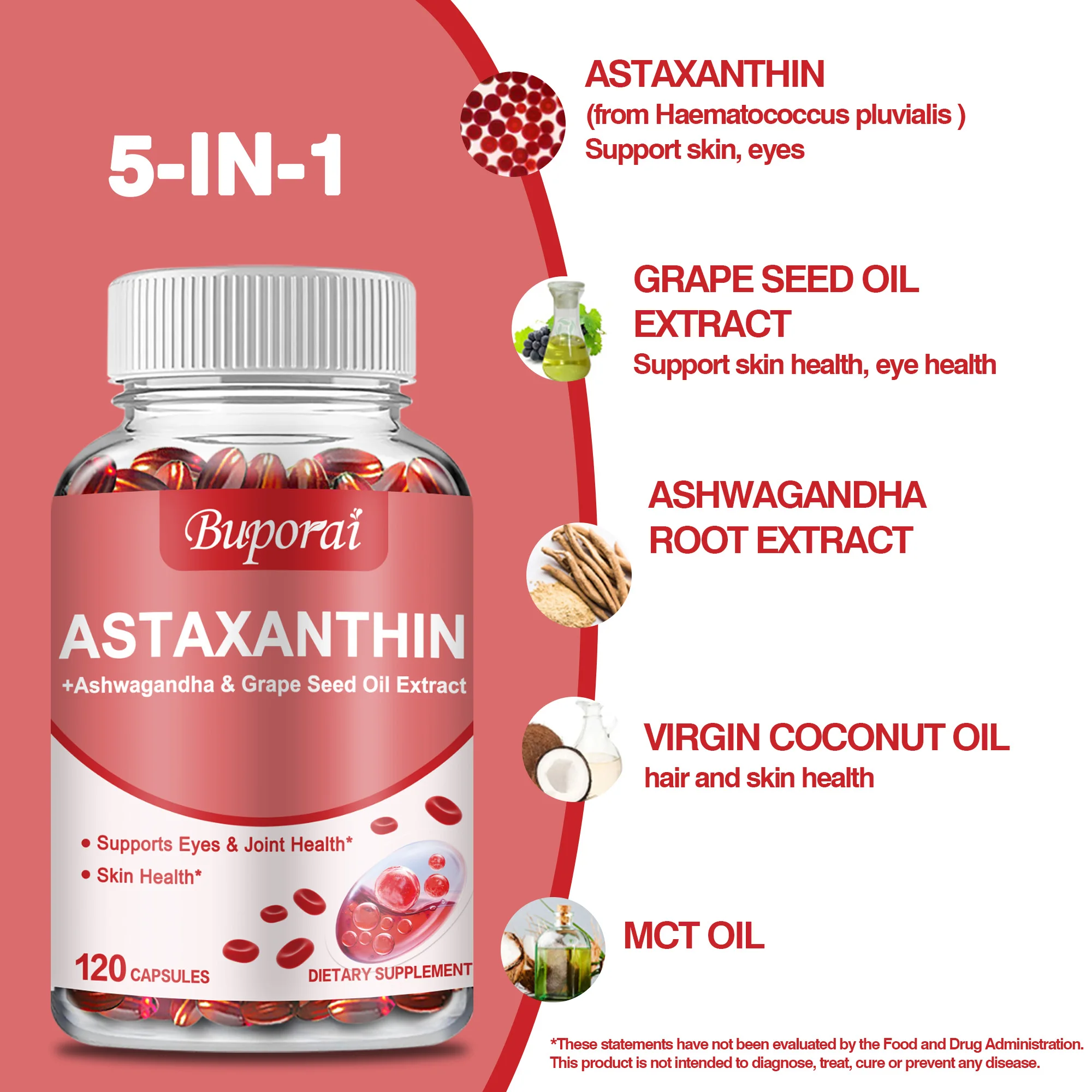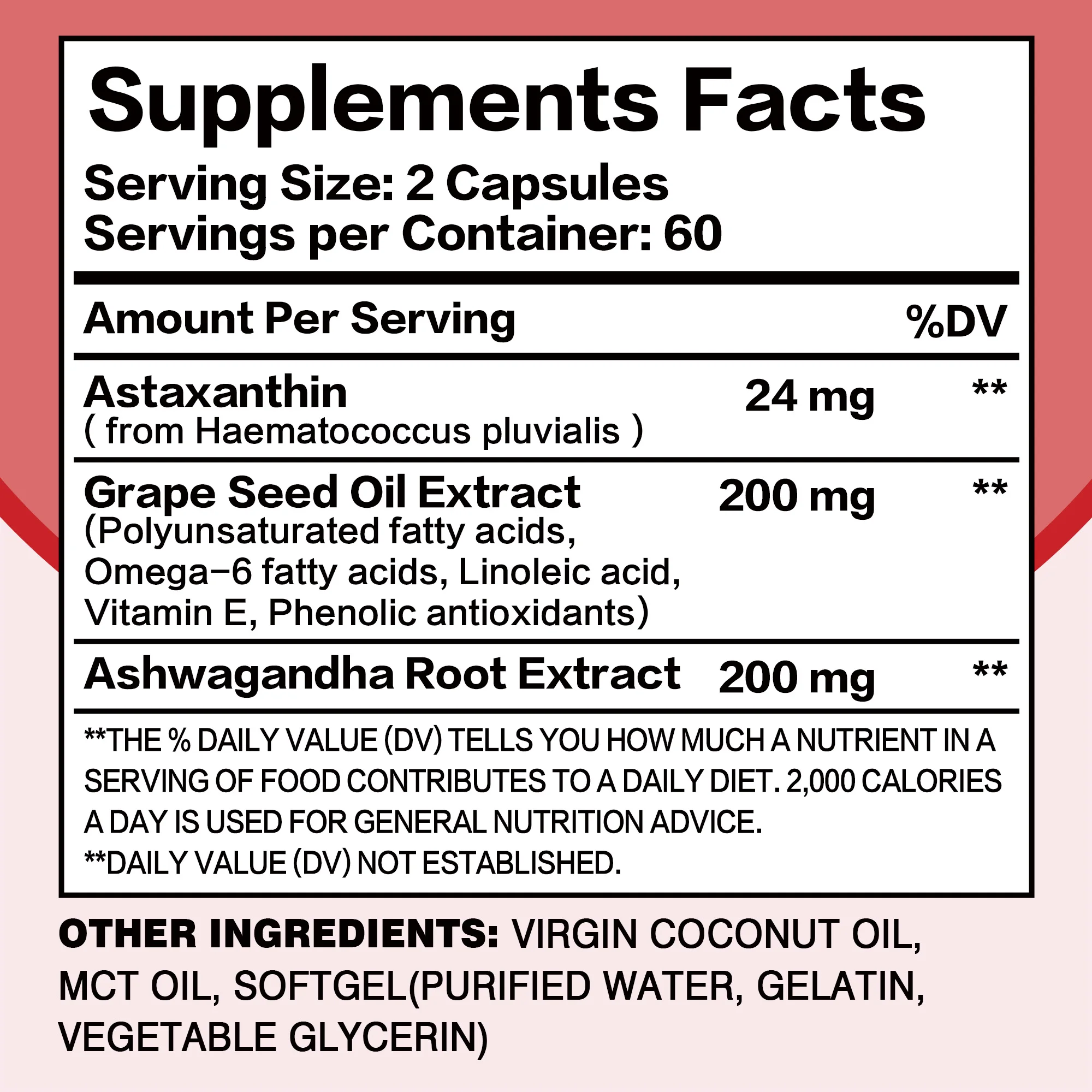 Ingredients: Astaxanthin, Grape Seed Oil Extract, Ashwagandha Root Extract