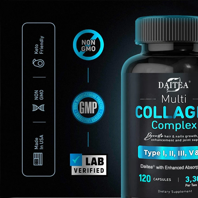 All-in-one collagen supplement: Our collagen supplement combines hydrolyzed collagen peptides from beef, seafood, chicken bone broth, and eggshell membrane sources with small collagen types I, II, III, V in capsule form, making it a one-stop shop for your collagen needs.