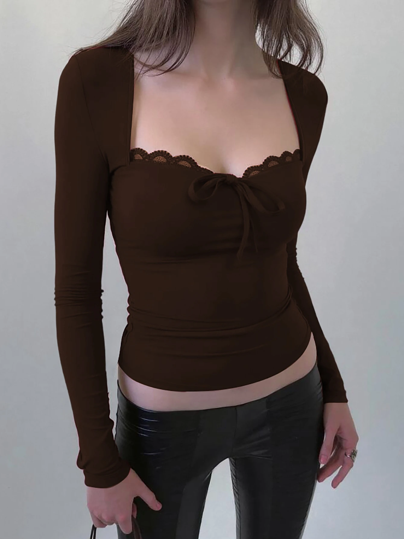 Dulzura 2025 Autumn Latest Fashion Sexy Square Collar Long Sleeve Slim Lace Up Lace Ruffles Patchwork T-Shirt Party Club Clothes