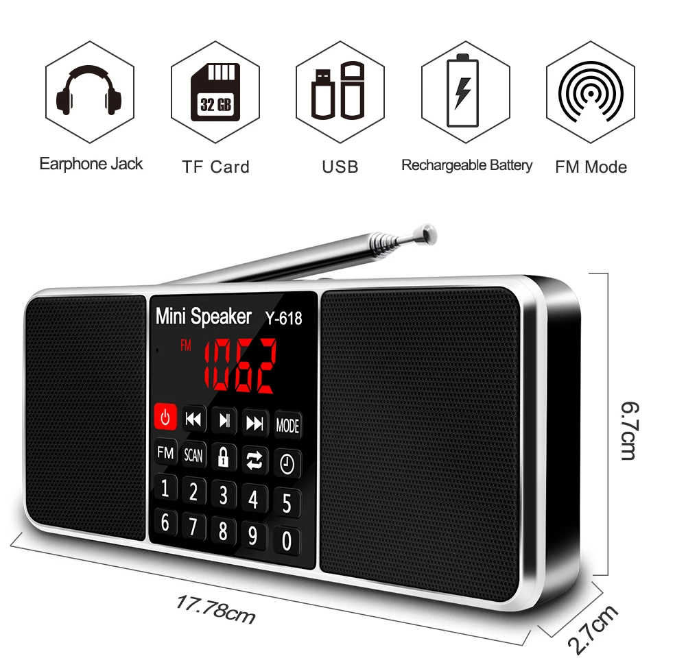 Y-618 radio combines with the fm radio frequency and speaker features, MP3 player, support the TF Card, USB drive, AUX audio input and 3.5mm earphone .