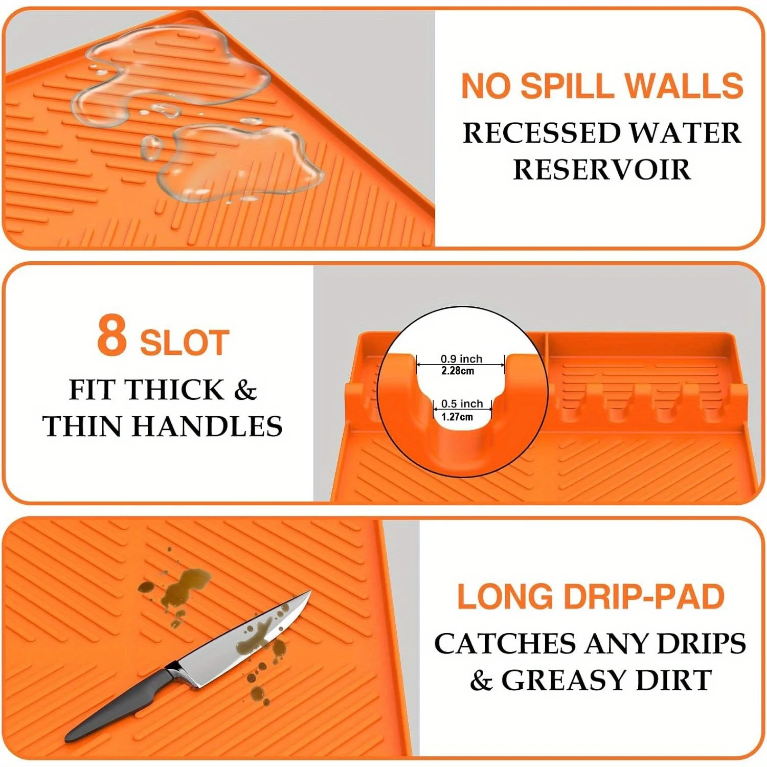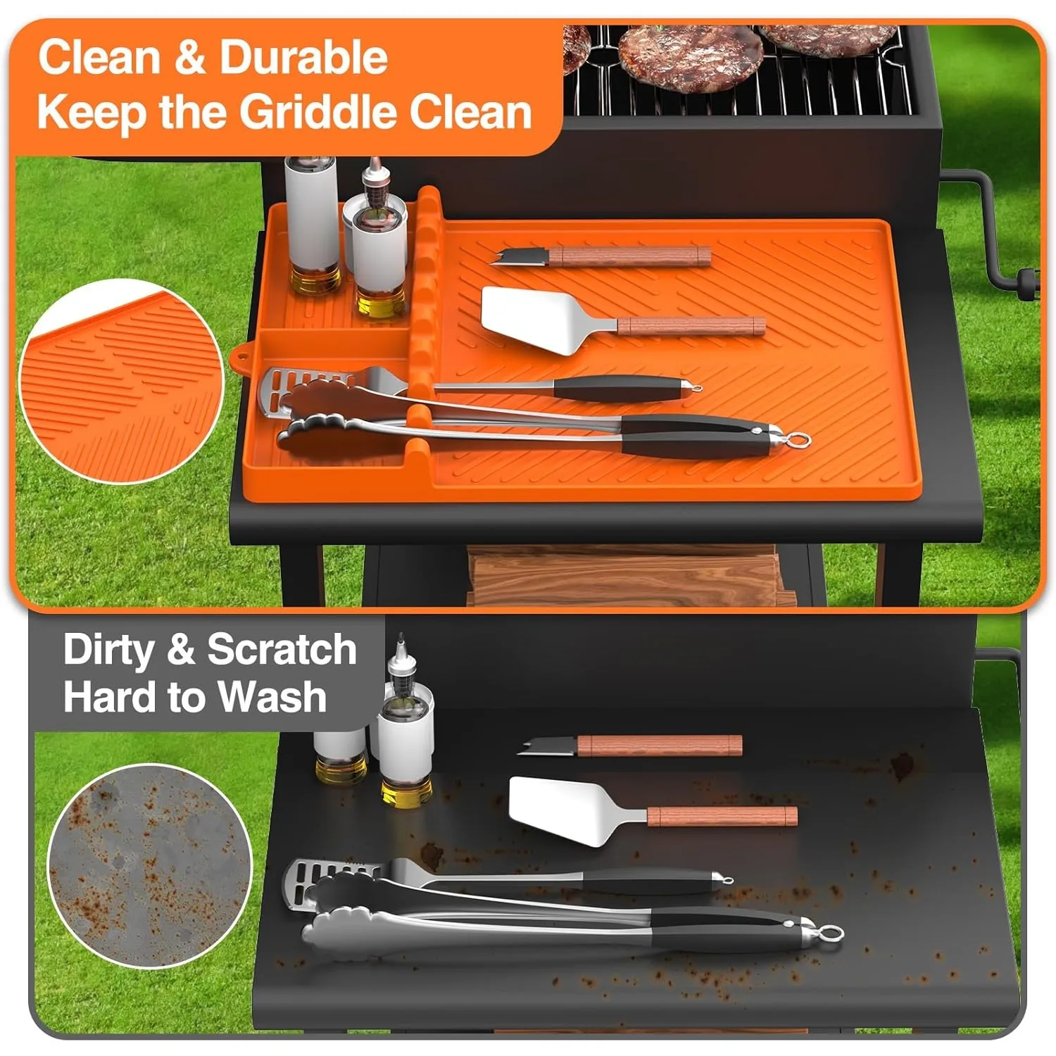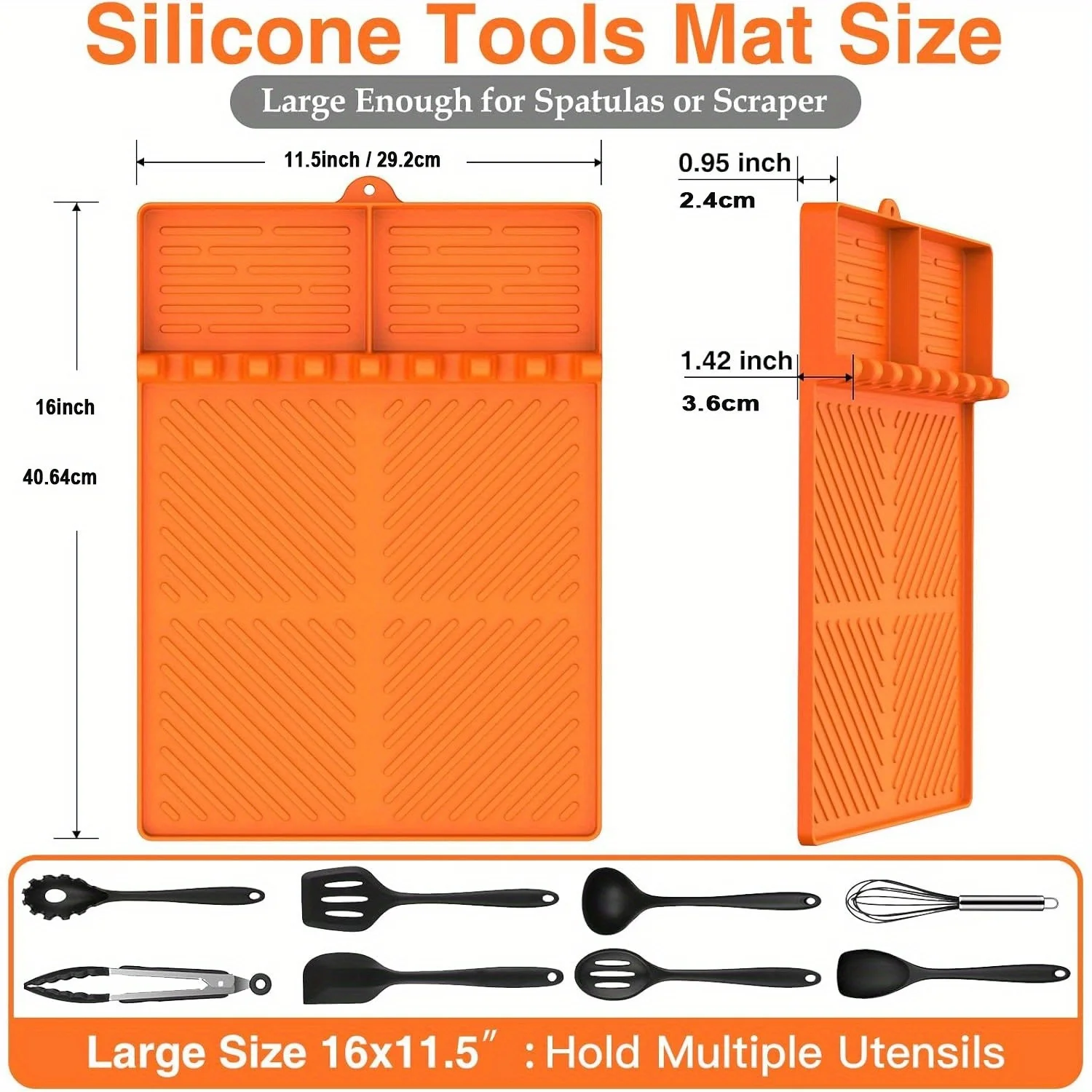 【Large Spatula Mat】 – Measures 16" x 11.5", with 8 convenient slots and 4 Zones, providing ample space to park your utensils and keep them separated while multitasking, extra large and wide enough for your grilling needs, non-slip, spacious enough, you can place this mat on the counter or side shelf to rest all your tools on, to protects countertops or griddle shelves from grimy spatulas, knives, and tongs.