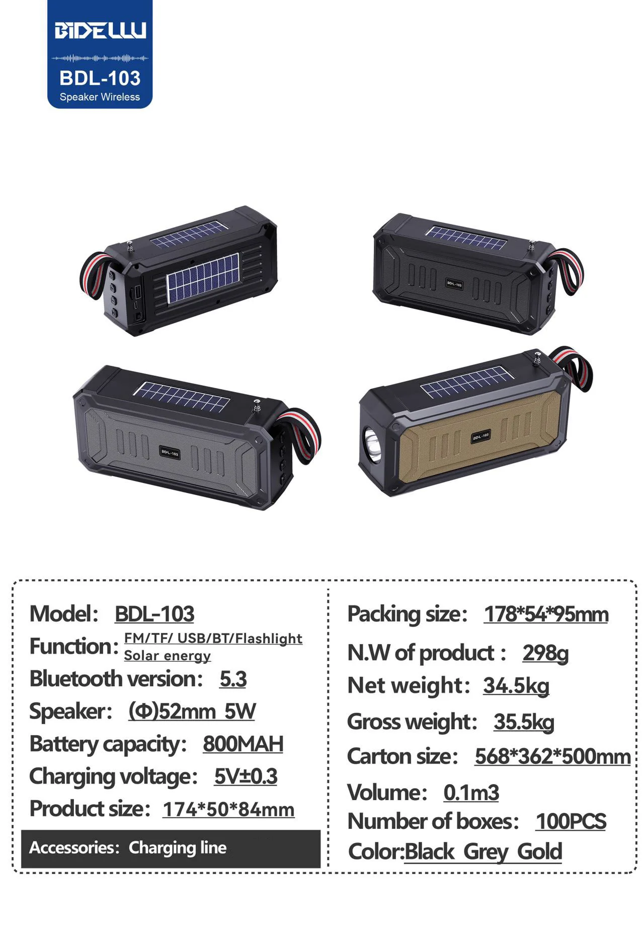 * Main functions: FM radio/Bluetooth speaker/TF card MP3 player/USB MP3 Player/Solar charging/Flashlight